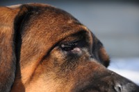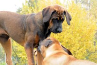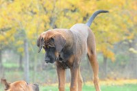 Velká a mohutná fenka tmavě červené barvy, silné kostry.